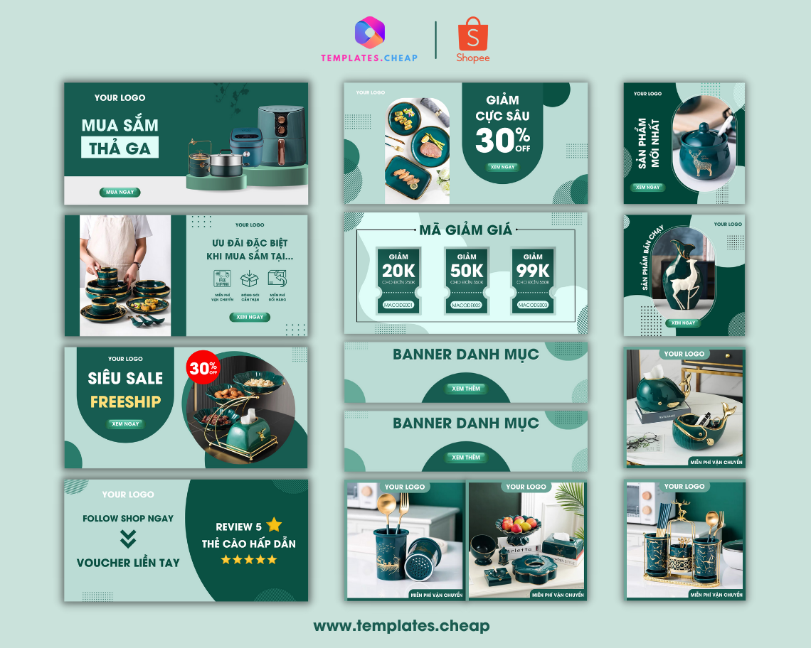 Bộ Templates Gia dụng Shopee/ Lazada – Tone xanh ngọc lục bảo
